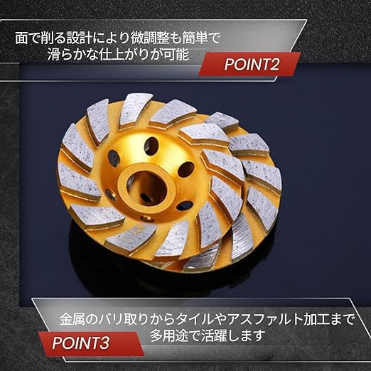 【滑らかな仕上がりと作業効率を両立】コンクリートや石材、レンガ、大理石など硬質素材を均一に研磨できるダイヤモンドカップホイール4個セット。面で削る設計により微調整も簡単で、滑らかな仕上がりが可能。金属のバリ取りからタイルやアスファルト加工まで、多用途で活躍します。ディスクグラインダーに装着するだけの手軽さで、DIY初心者からプロまで使用可能。作業効率を大幅に向上し、信頼の仕上がりを提供します。