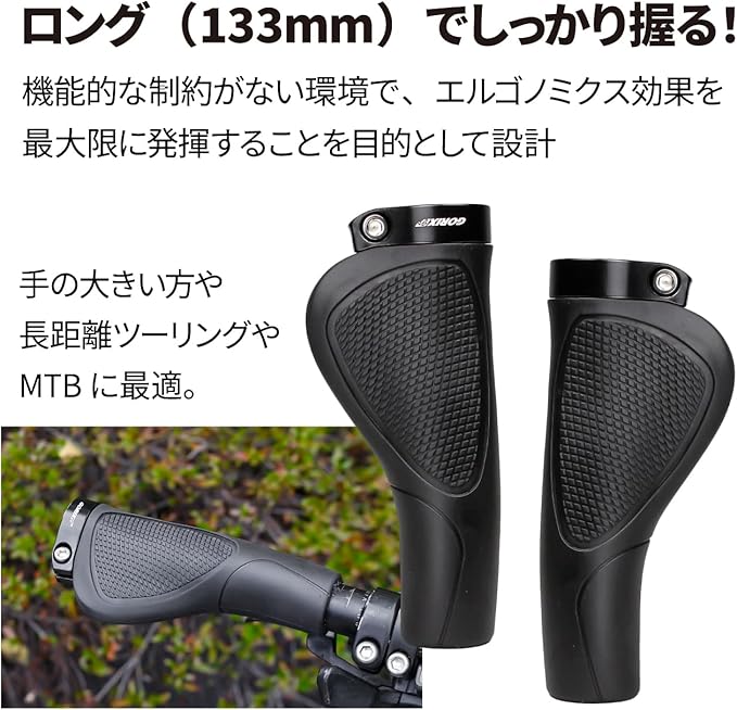 【選べる2サイズ!あなたの自転車と手に最高のフィット感を】 GQZ-COMF-L(133mm・約180g):ロングサイズで、手の大きい方やツーリング・MTB・クロスバイクのハンドルに最適。 GQZ-COMF-S(92mm・約155g):ショートサイズで、変速機(シフター)付きの日常使いの自転車(シティサイクル、ママチャリ)に乗っていて、手の疲労を減らしたい方などに最適。