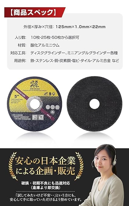 ■外径 厚み 穴径(mm):125 1.0 22mm ■入り数:10〜50枚入 【注意事項】保護メガネ・マスクなど安全保護具を着用して正しく安全にご使用下さい。オーバースピードや側面使用はしないでください。砥石に、カケ、歪み、ヒビ、ワレ、水ぬれ、油ぬれなどの使用上有害な欠陥がないことを確認してください。
