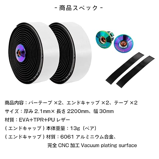 【商品内容】:バーテープ 2、固定式エンドキャップ 2、エンドテープ 2【サイズ】:厚み2.1mm 長さ2200mm、幅30mm【材質】:EVA+TPR+PUレザー【(エンドキャップ)本体重量】:13g(ペア)【(エンドキャップ)材質】:6061アルミニウム合金、完全CNC加工Vacuum plating surface