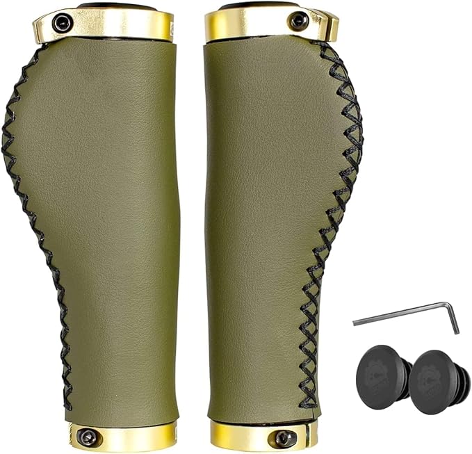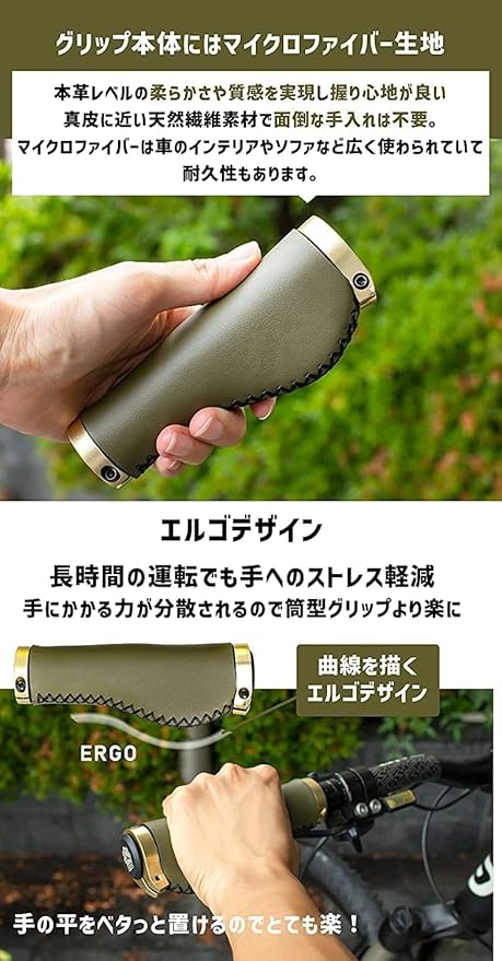 【商品内容】:自転車グリップ、エンドキャップ、取付け六角工具【サイズ】:長さ138mm【材質】:マイクロファイバー【正味重量】:約180g(ペア)【カラー】:オリーブ