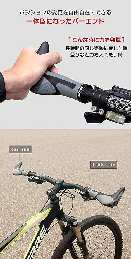 マウンテンバイクやクロスバイクなど、フラットハンドルの自転車に最適なグリップです。 バーエンドとグリップが一体化したグリップ。