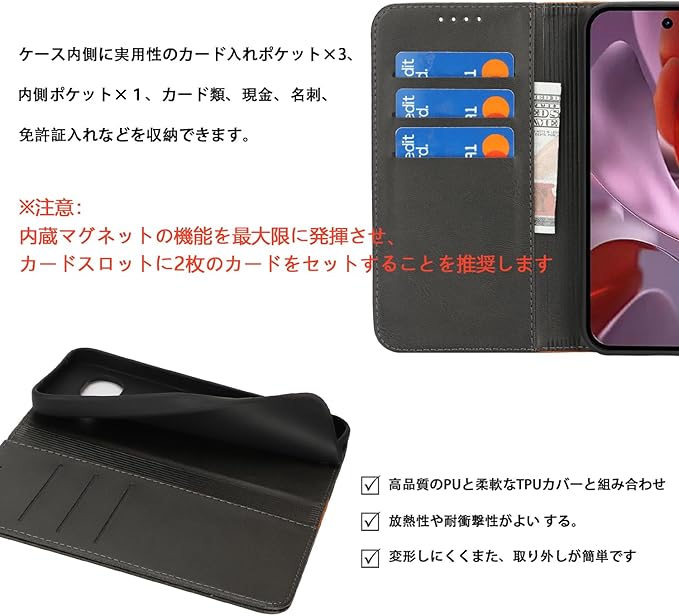 【収納機能】Google Pixel 4A 5Gケース内側には三つのカード入れとフリーポケットがつき、カード類や紙幣、名刺などが収納できます。カードスロットに2枚のカードを入れると、内蔵マグネットの機能を最大限に発揮し、カードが消磁されるのを防ぐことができます。横置きスタンド機能が付き、横向いて斜めに立てて、自由に角度を調整して、お好みの角度で動画鑑賞や読書などを楽しめます。長時間での新幹線、飛行機の中での暇つぶしに最適です。