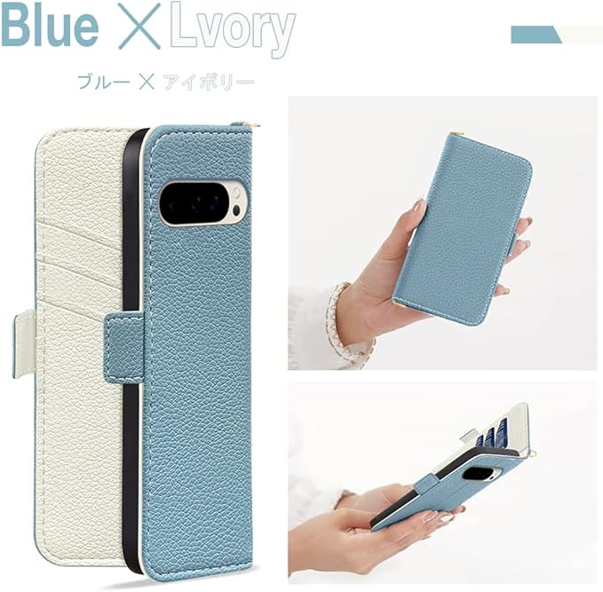Kahper for Google Pixel 9/Pixel 9 Pro 5G ケース 手帳型 おしゃれ グーグル ピクセル9 / 9Pro ケース 手帳型 可愛い スマホケースGoogle Pixel 9 Pro マグネット式 ピクセル9 手帳型ケースカード収納 スタンド機能 Pixel 9 カバー 擦り傷防止 高級PUレザー 軽量耐衝撃 全面保護 放熱性 人気 女性(ブルー メ アイボリー)