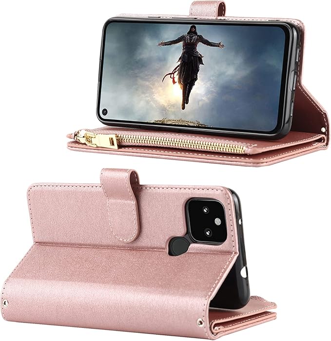 for Google Pixel 5A 5G ケース for google pixel5a 5g 縄掛けケース 手帳型 財布型 ICカード コインポケット ストラップ付き カード 収納 小銭入れ ファスナーポケット付き PUレザー 6色ピンク