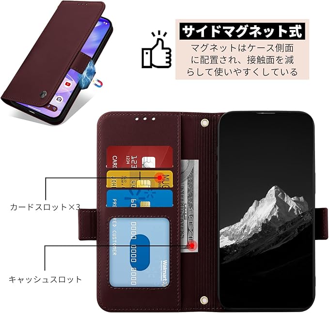 マグネット内蔵このスマホケースぴくせる9aは、手触りの良いレザー製で、食べこぼしや日常の磨耗から守る防水加工が施されています。持ち運びが簡単で軽量、携帯電話を入れても重く見えず、毎日の使用に適しています。