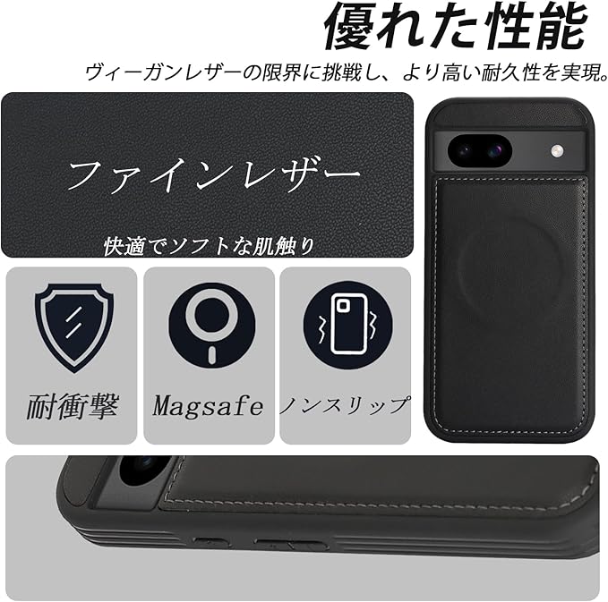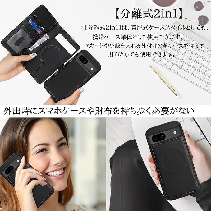 Havaya Google Pixel 8a ケース 手帳型 MagSafe 対応 ピクセル8a ケース カード収納 マグセーフ対応ケース 耐衝撃 全面保護 フェイクレザー 【分離式2in1】スタンド機能 ワイヤレス充電対応-ブラック