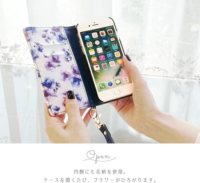 【美しい花柄デザイン】優しいカラーリングが大人かわいい花柄の手帳型 スマホケース。ケースの外側・内側、さらにストラップの内側にも花柄を使用しております。ケースの角には上品に輝くゴールドパーツを施しました。細部にまでこだわったスマホケース 手帳型です。【素材】上質で手触りの良い"アーティフィシャルレザー"を採用、内部のケースはブラックのポリカーボネートケースを使用しています。