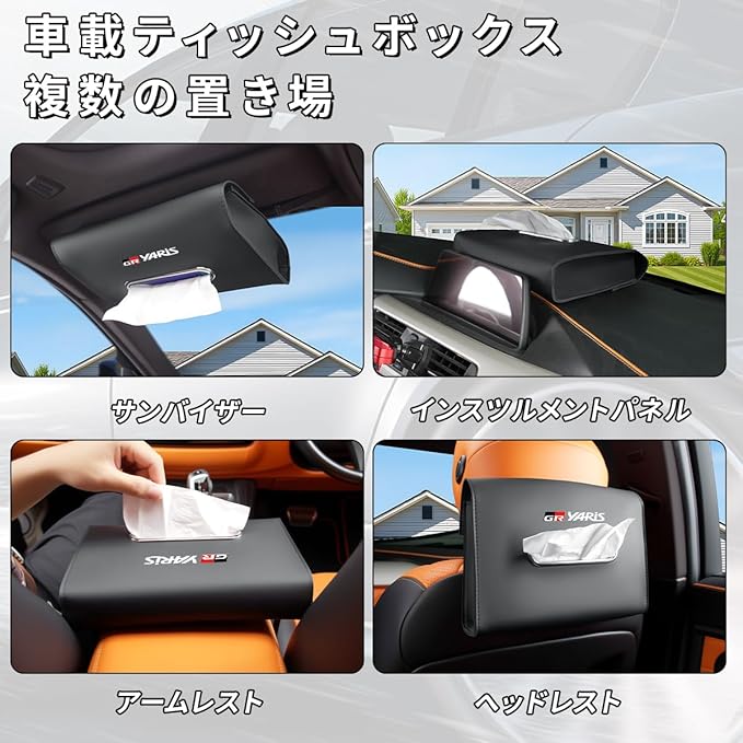 GR ヤリス カー ティッシュボックス PUレザー 吊り下げ式ティッシュホルダー サンバイザー/ヘッドレスト/アームレスト/インストルメントパネル/後部座席 隠し式スナップボタン付き 対応 GR YARiS 専用ロゴ 厚さ7CM 車 ティッシュカバー GR ヤリス 10系 RZ RC 車 ティッシュ収納ケース 便利グッズ アクセサリー 内装パーツ