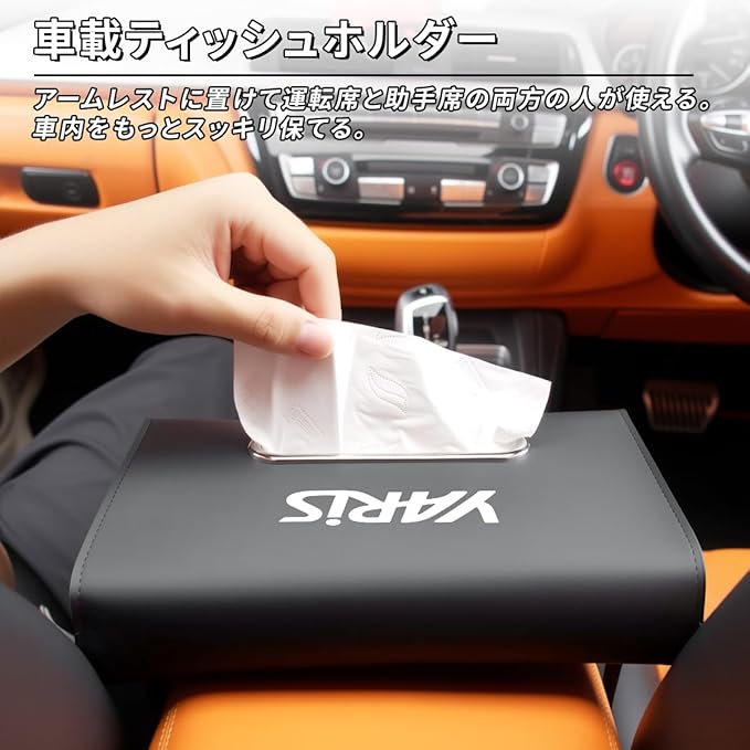 【合理的な設計】この車用ティッシュケースは YARiSロゴが印刷されており、高品質な PU レザーで作られているため、上品な質感を持ち、お手入れも簡単です。対応 ヤリス 新型 ヤリスYARiS X G Z 車内のインテリアとスタイルが完璧に調和し、お客様の個性的なニーズに応えます。車内でティッシュが散らかって収納が難しい問題を解決しつつ、車内の美しさと清潔さも向上させます。素材は柔らかく、触り心地が良く、ドライブ中に異音が発生したり、車内のインテリアに傷がつくのを防ぎます。お客様がより便利にティッシュを収納し、スムーズに取り出しできるように配慮されています。