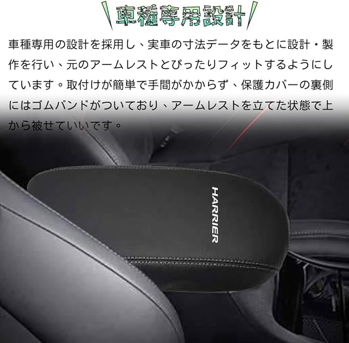 【車種専用・取付簡単】:車種専用の設計を採用し、実車の寸法データをもとに設計・製作を行い、元のアームレストとぴったりフィットするようにしています。取付けが簡単で手間がかからず、保護カバーの裏側にはゴムバンドがついており、アームレストを立てた状態で上から被せていいです。