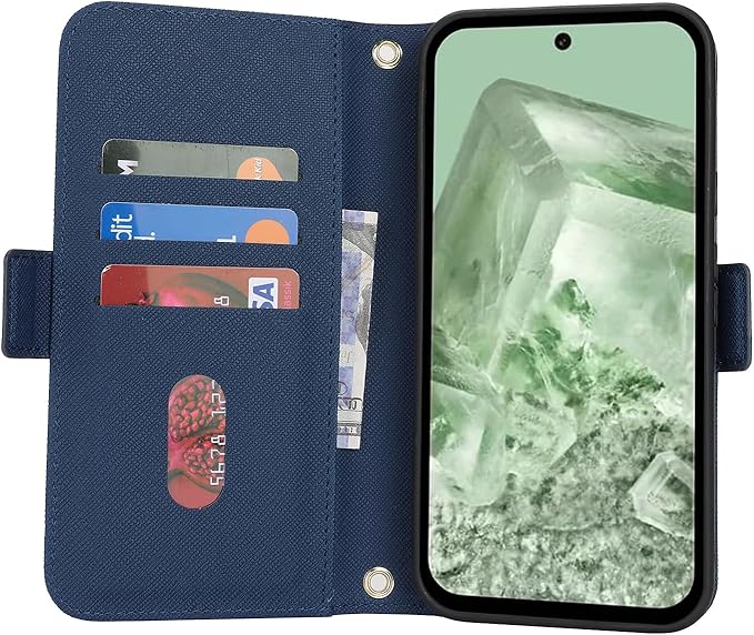 Pelanty for Pixel 8A 手帳型ケース 縄掛け肩掛け斜めがけ ショルダー 合成皮革+TPU 携帯カバー 化粧鏡付き ストラップ付き マグネット for Google pixel8a 財布型カバー ICカードポケット お札入れ小銭入れ大容量 収納ポケット スタンド機能 グーグル ピクセル8a 耐衝撃(肩縄付き-ブルー)