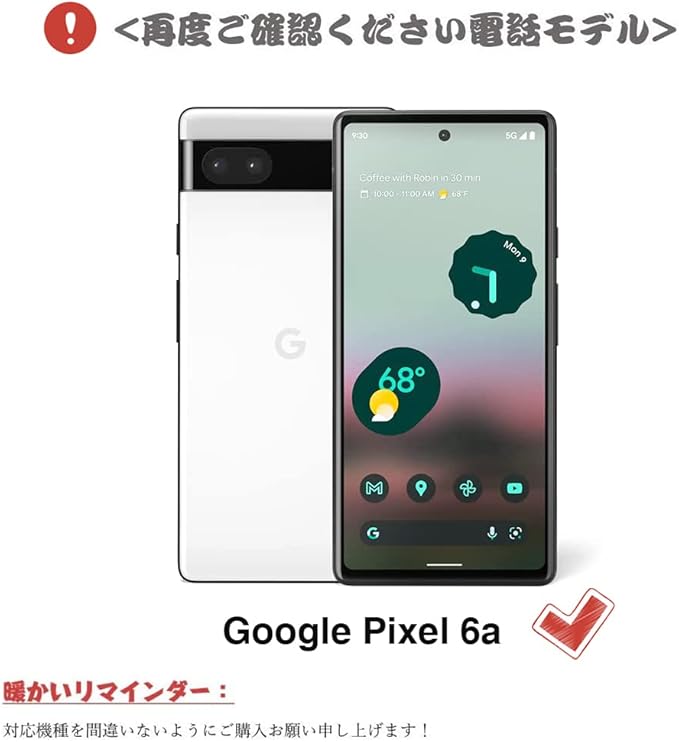 【対応機種】6.1インチの google pixel 6a の手帳型ケースです、対応機種と画面サイズをよくご確認のうえ、ご購入いただけますようお願い致します。機種によって各種ボタンの穴が開いており、ジャケットを着脱せずに、充電コネクターの接続、タッチパネル操作が可能です。専用カメラ穴が開いており、本製品を装着したまま、カメラでの撮影が可能です。