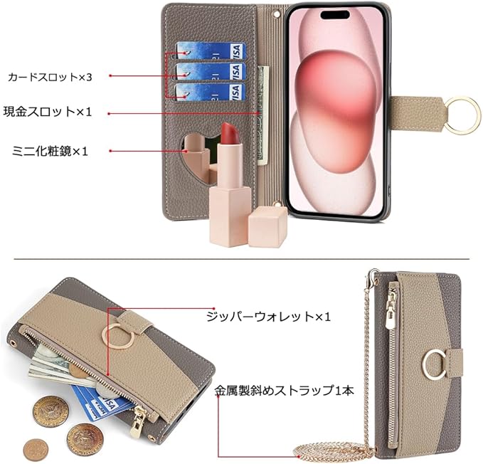 【収納力抜群&横置スタンド機能】折畳み式のデザインにより、カード収納力がもっとレベルアップされました。ケースの側面にはカードスロットと1つのフリーポケットがあり、ジッパー付きの収納スペースもあります。フリーポケットに現金やレシート、ファスナーバッグは小銭と鍵なども収納できます。横置きスタンド機能が付きまして、両手を解放させてお気軽に読書やビデオの観賞を楽しむことにしましょう。スマートフォンを装着してから、カメラ、電源ボタン、音量ボタン、イヤホンジャック、コネクタ等が邪魔無しでそのまま使用可能です。