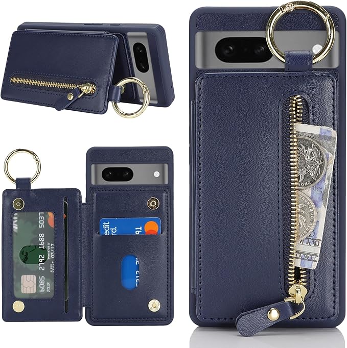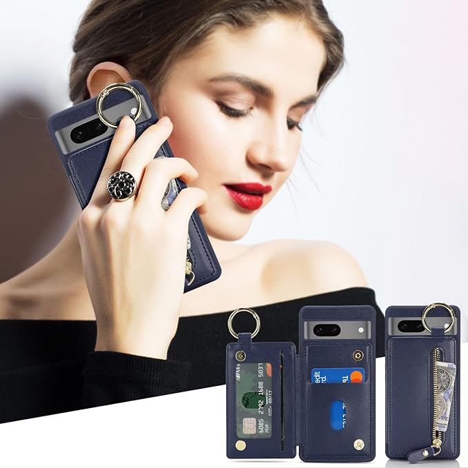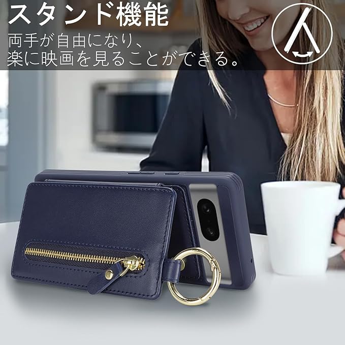 Havaya 対応 Pixel 7a ケース ピクセル7a ケース カード収納 米軍MIL規格 リング付き キーホルダー キーリング Google 耐衝撃 au docomo スタンド機能 SoftBank 財布 フェイクレザー-ブルー