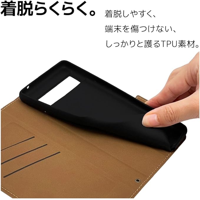 【便利な多機能仕様】フタの内側に「カードポケット」が3つ付いています。 ストラップ等を取り付け可能な「ハトメ」がケース下部に付いています。 ※Google Pixel 7a ( グーグル ピクセル7a ) 専用ケースのハトメを使用する場合は、ストラップのみで宙吊りにするご使用方法はおやめください。 ケースから機器本体がはずれ落下し破損や損傷等の原因となります。 背面を折り曲げて「視聴スタンド」として使用が可能です。