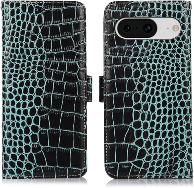 for Google Pixel 8A ケース 手帳型 本革 ワニ柄 for グーグル ピクセル8A 牛革 財布型 鰐柄 クロコダイル柄 耐衝撃 [RFIDブロッキング] カード収納 マグネット式ボタン 横置きスタンド機能 便利 財布型携帯 スマホケース 水色 Rureu01
