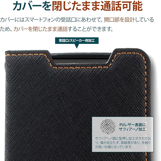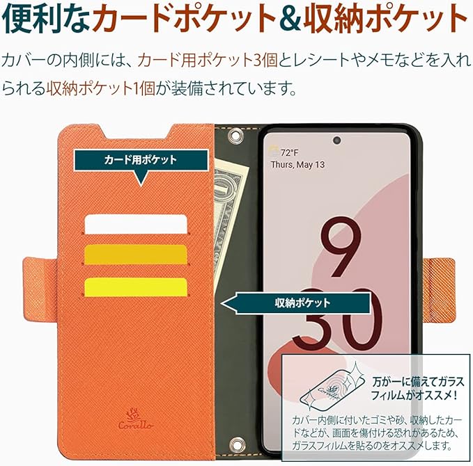 【Corallo】 Pixel 6a 対応 ケース 手帳型 ストラップ 手帳 スマホケース マグネット ベルト 薄い 手帳型ケース カバー カード 収納 スタンド 付 サフィアーノ レザー 手帳型カバー [ Google Pixel6a グーグル ピクセル6a 対応 ] NU ブラック オレンジ