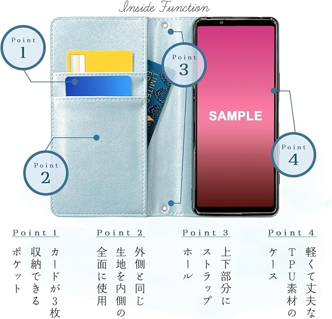 【内側黒TPU】本体をはめるTPUケースは機種により電源、サイドボタンの穴が開いておらずケースの上から押していただく仕様になっております。手帳部分とケース部分は接着しておりますが、強くめくると剥がれる場合がございます。