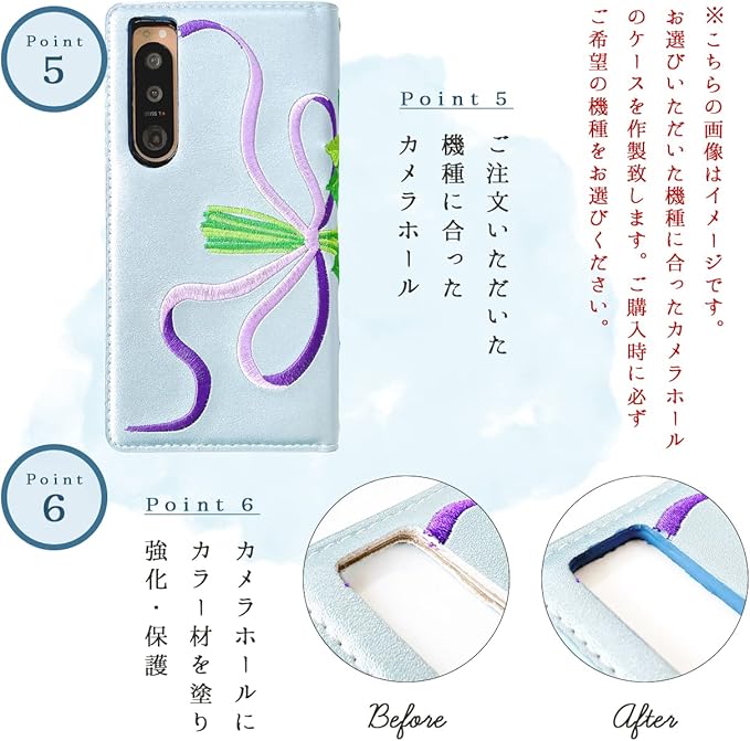 手触りの良いなめらかなPUレザーを使用しております。カメラ・指紋認証の開口部には1点ずつ手作業で丁寧にカラー材を塗って、コーティングしております。ストラップ穴があるため、様々なアレンジが可能となります。機種によってカメラ穴や指紋認証の開口部は異なります。