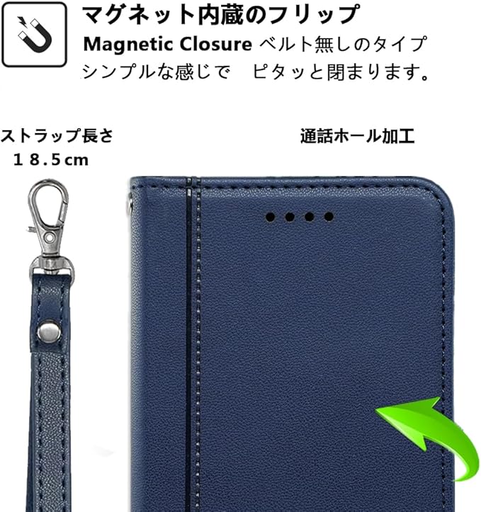 【機能性2:ストラップ付き】ストラップホール付きです。スマホカバーと同じの色合いを持つスプリングシャックル式のハンドストラップも同梱販売です。取替が易くて使い勝手が良いのです。ストラップの長さ:18.5cm。やはり持ち歩けにはストラップ付きのほうは安心感がもっとアップとなります。