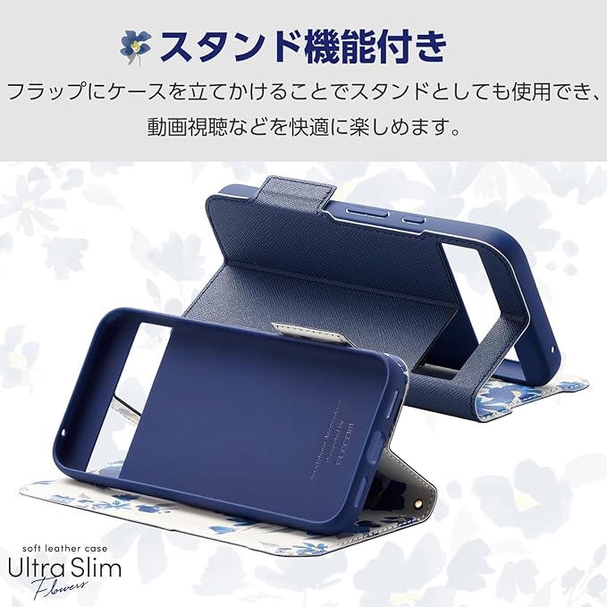 エレコム Google Pixel 8a ケース カバー 手帳型 ソフトレザー TPU 耐衝撃 衝撃吸収 軽量 薄型 カード収納 ポケット スタンド機能 財布型 ワイヤレス充電 対応 マグネット内蔵 おしゃれ 可愛い 花柄 ネイビー PM-P241PLFUJNV