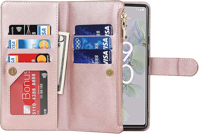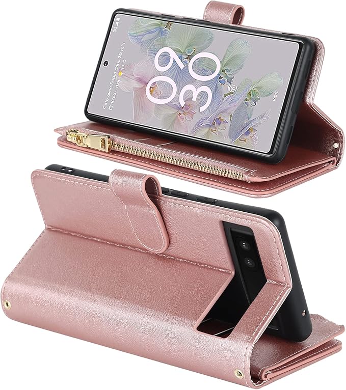 Eastwave for Google Pixel 6A ケース for pixel 6a 縄掛けケース 手帳型 財布型 ICカード コインポケット ストラップ付き カード 収納 小銭入れ ファスナーポケット付き PUレザー 6色ピンク