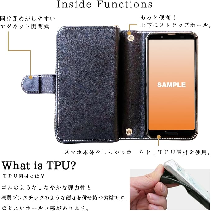 【内側黒TPU】本体をはめるTPUケースは機種により電源、サイドボタンの穴が開いておらずケースの上から押していただく仕様になっております。手帳部分とケース部分は接着しておりますが、強くめくると剥がれる場合がございます。