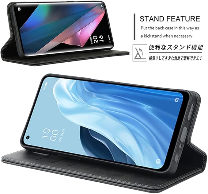 【特徴2】:スマホを横置きにしての視聴は不可欠なので、本ケースはスタンド機能が付きます。横向いて斜めに立てて両手を解放し、お気軽に読書やビデオの観賞を楽しむことができます。
