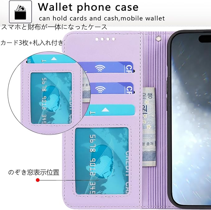 【カード収納&マグネット式】:窓ソケット+サイドポケットでカード最大3枚を収納可能。磁石をフープの留め具部分に配置することで、カードへの磁気影響を低減、ケースの閉じ付け力を強化。