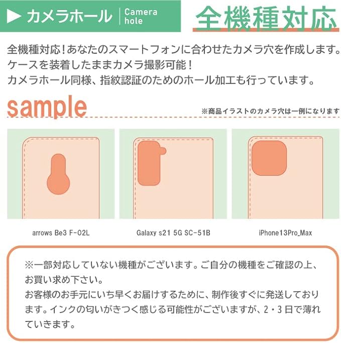 各機種専用のケース:商品画像にはiPhone用のものを参考に掲載しておりますが、ご注文いただいた機種に合わせてカメラホールなどが開いております。また、指紋認証がある機種の場合は、指紋認証センサー用の穴も空いておりますので、ケースに装着したまま各機能をお使いいただけます。