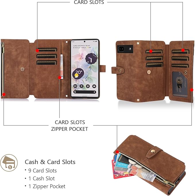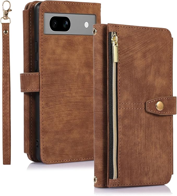 UEEBAI ケース 対応 Google Pixel 7a 5G 用の ケース かわいい ジッパー付き携帯電話ケース 高級PUレザー 携帯カバー おしゃれストラップ付き ハンドメイド ケース カード収納手帳型ケース マグネット式 財布型スマホケース スタンド機能 手帳型ケース 軽量 耐衝撃 全面保護ケース 人気ケース-ブラウン