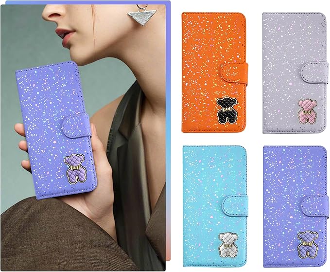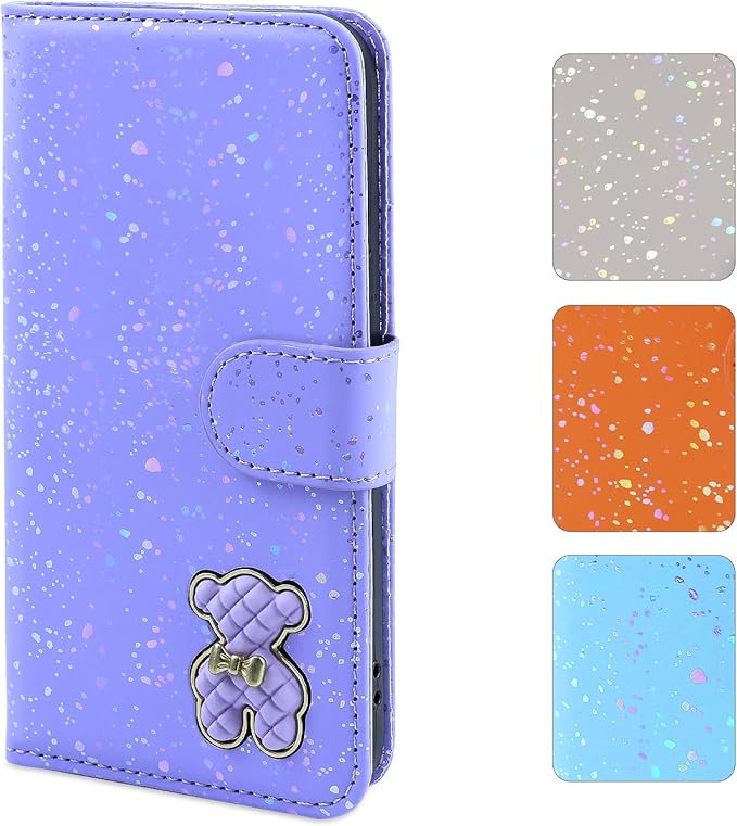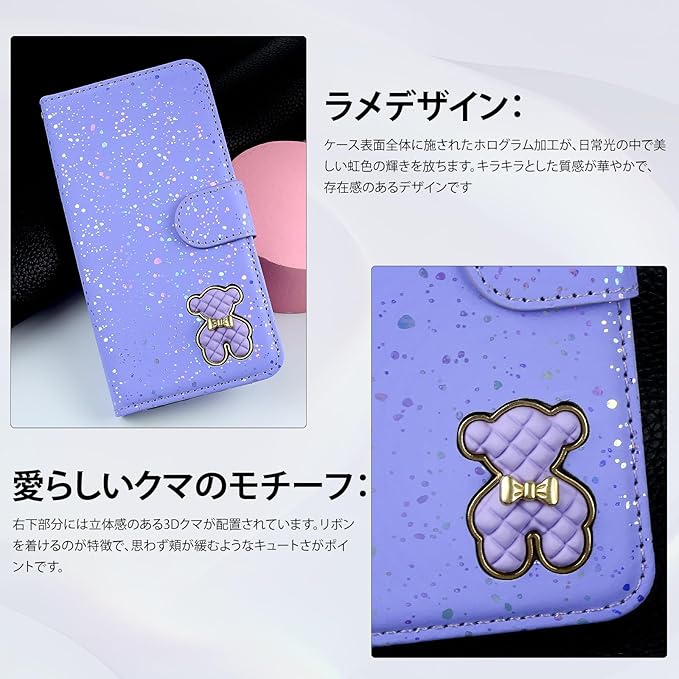 ぐーくるぴくせる9 ケース グーグルピクセル9プロ ケース 手帳型 耐衝撃 かわいい こぐま リボン 虹色 クマチャーム カード収納 スタンド機能 ストラップ付く キラキラ 可愛い-パープル