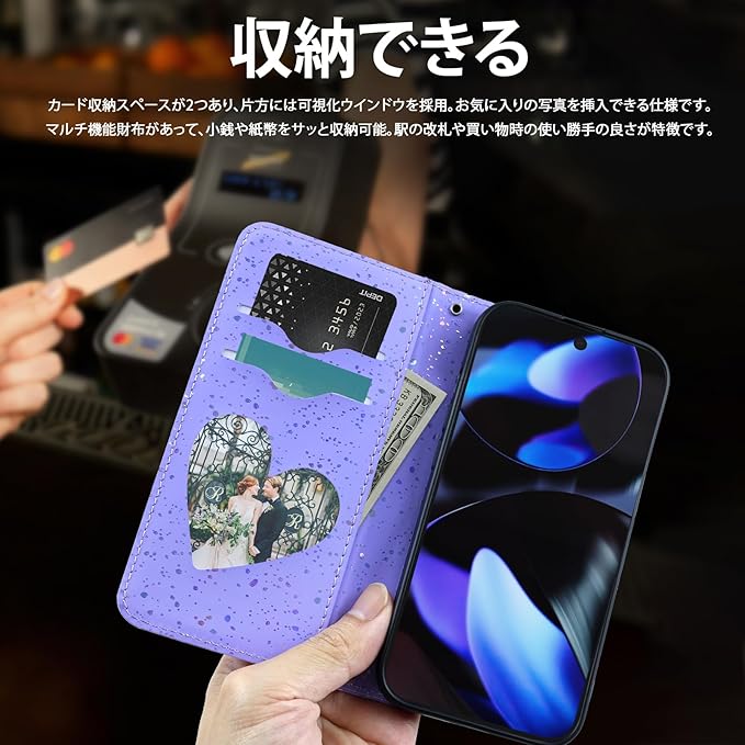 【収納力&パーソナライズ】3-in-1多機能仕様:内側に2つのカードスロット(最大2枚収納)と札入れを配置。ハート型の透明ウィンドウ付きスロットで、お気に入りの写真やメッセージカードを展示可能。ピクセル9 ケース グーグル ピクセル 9 ケース ピクセル9 ケース 手帳型 グーグルピクセル9 ケース 手帳型