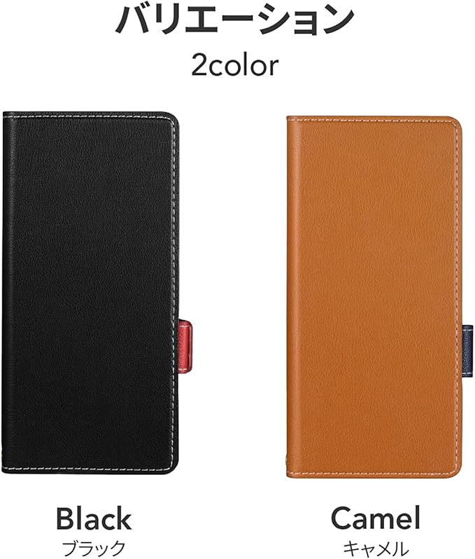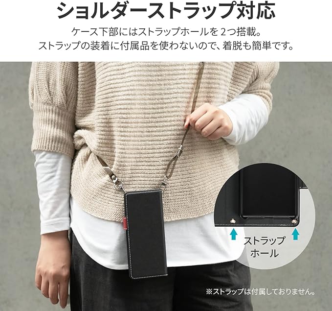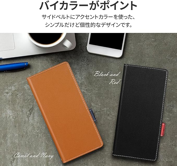サイドベルトがバイカラーになった遊び心ある手帳型ケース/ピタッと固定できるマグネット仕様/すぐ取り出せて嵩張らないカード収納ポケット(1枚)/動画視聴に最適なスタンド機能/ショルダーストラップが使える2つのホール搭載