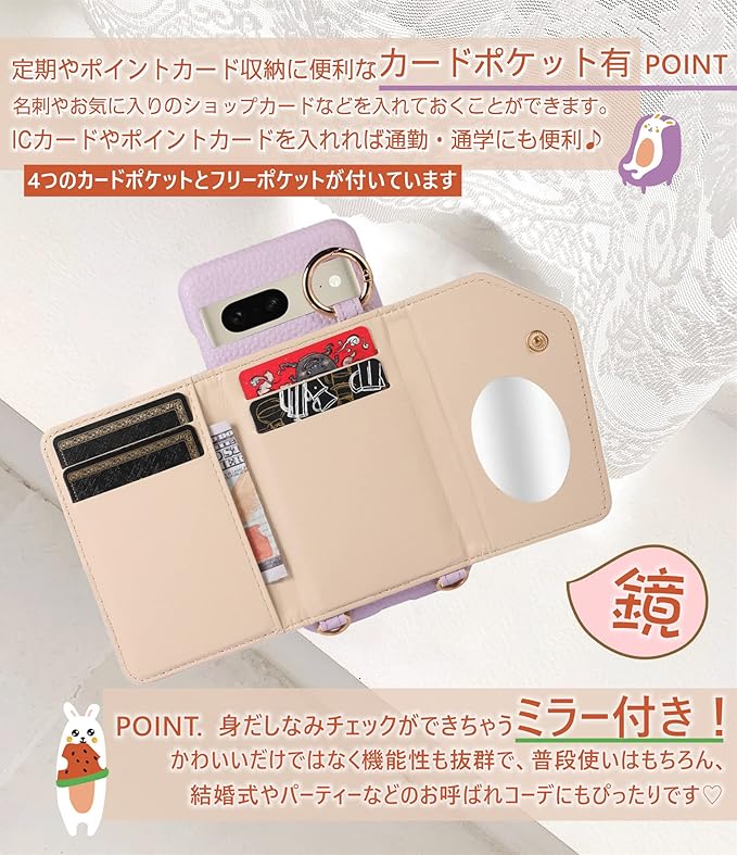 Google Pixel7 ケース ショルダー ストラップ FASY グーグル ピクセル7 カバー Google Pixel 7 スマホケース ショルダー タイプ ミラー 鏡付き グーグル ピクセル 7 スマホストラップ 肩掛け 背面手帳型 かわいい おしゃれ 革 耐衝撃 ショルダー GooglePixel7 スマホ 携帯 ケース ショルダー 斜め掛け リング付き 首掛け ストラップ ラベンダー