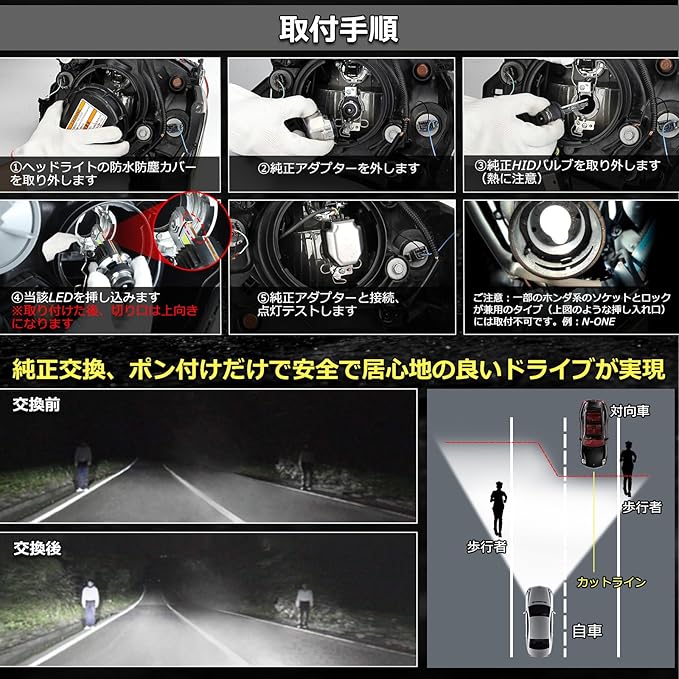 「純正HIDを超えた明るさ 瞬間起動」当該LEDは10年以上にわたる研究の成果を結集し、進化した高発光率かつ高品質なLEDチップを搭載しています、純正HIDに比べて、著しく明るい光を放ち、更には広範囲にわたって均一に照射されます。また、徐々に明るくなるHIDと違い、LEDの優れた特徴は点灯して瞬時に最大光量になりますので、緊急時においても迅速に最大の明るさを提供し、安全保障を確保することができます。