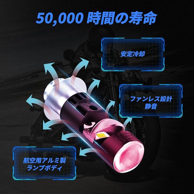高効率放熱・持続性能——高品質アルミニウム筐体と先進的な放熱システムが長期安定動作を保証。12000回転高速タービンファン搭載により、PH7バイク用LEDヘッドライトは長時間使用でも低温を保持。60000時間以上の安定動作を保証。
