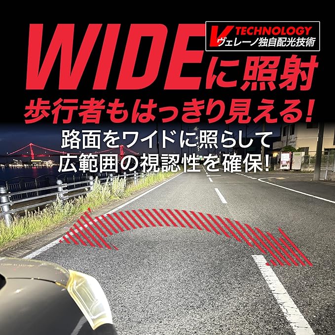 圧倒的な明るさで夜間の視界を確保。VELENOのH4 LEDヘッドライトは、純正バルブの約32倍となる実測値12700ルーメンの明るさを誇ります。 車検基準32倍のこの高輝度により、夜間走行時の視界が飛躍的に向上し、道路状況や障害物を早期に発見できます。明るいヘッドライトは、ドライバーの反応時間を短縮し、事故のリスクを低減する効果があります。さらに、明るいライトは他の道路利用者からの視認性も高め、安全性を向上させます。このような特徴は、夜間や悪天候時の運転に不安を感じる方にとって、大きな安心材料となります。