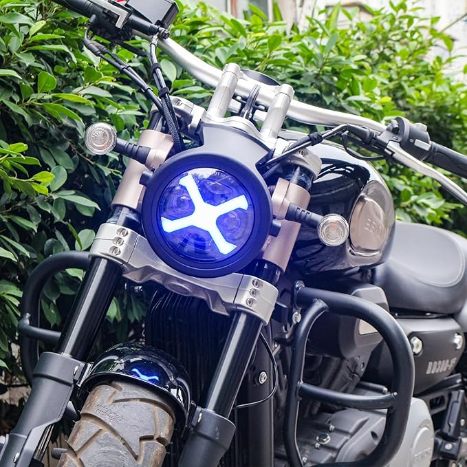 Motikvansled バイク ヘッドライト LED 5.75インチ60W X-タイプ オートバイ ヘッドライト汎用ハウジング&ブラケット付き 丸型 プロジェクター Hi/Lo切り替え 青い DRLデイライト 6000K高輝度ハーレー ヤマハ ホンダ マグナ50 h4 モンキーIP68防水 (X青)