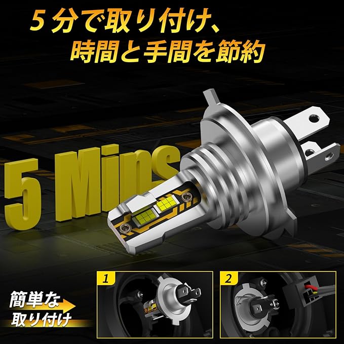 【5分で簡単取付プラグ&プレイ】 純正ハロゲン電球と同じ1:1サイズ設計で、加工不要で簡単装着。内蔵CANBUSドライバーにより99%の車両に対応し、工具不要で約5分で交換可能。バイクLEDヘッドライト H4 や H4 LED 車検対応 の代替としても人気です。