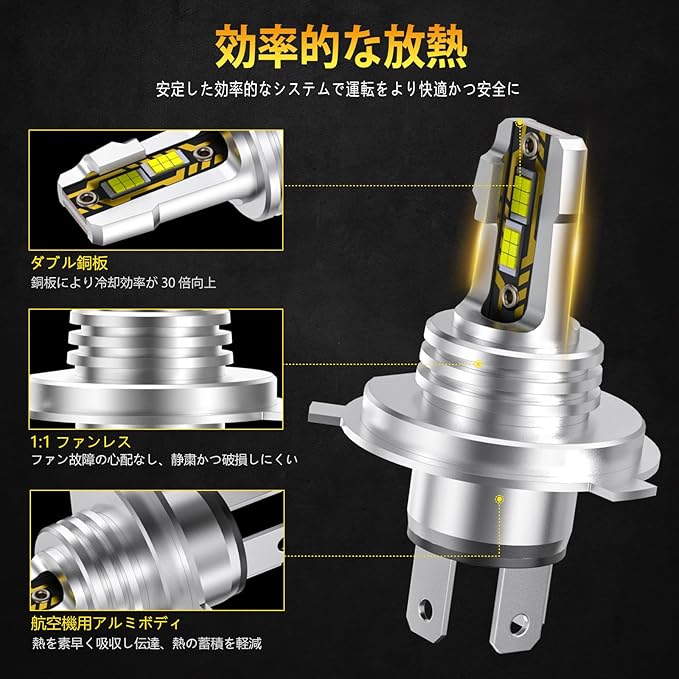 主な仕様 消費電力: 1セット60W(1本30W)、強力な照射を実現。全光束: 1セット16000LM(1本8000LM)、ハロゲン電球より500%明るい。モデル詳細: H4/HB2/9003 LED ヘッドライト バルブ。色温度: 6500K クールホワイト、昼光色に近く視認性を向上。材質: 航空機用アルミニウムボディで高耐久性と長寿命を実現。防水・防塵: IP68 等級で全天候に対応。動作電圧: DC9~18V、12V車両システムに適合。動作温度範囲: -40℃~+185℃、極端な環境下でも安定稼働。寿命: 50,000時間以上使用可能、交換頻度を大幅削減。特長優れた視認性: 高性能CSPチップ24個搭載、1:1理想ビーム設計で乱反射や眩惑を防止。必要な場所だけを明るく照らし、バイクや車のハイビーム用にも最適。高効率放熱: ダブル銅基板+ファンレス1:1設計+アルミニウムボディにより、効率的に放熱。長時間走行でも安定性能を維持。簡単取付: プラグアンドプレイで約5分、加工不要。h4 led 車検対応 の代替としても人気。高い互換性: 内蔵インテリジェントICドライバーで99%の車両に対応。バイクledヘッドライト h4、ライジング2 交換にも最適。