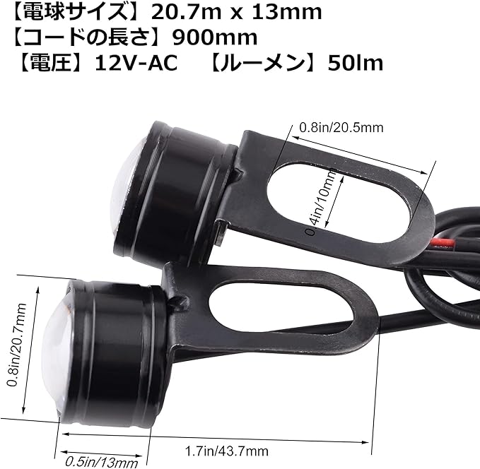 最新のSMDチップを3個採用! 高発光タイプのLEDなので、オートバイのバックミラー等に取り付ける事で、夜間の運転がより安全になります。 【配線方法】2本の配線の赤色が「+ 」黒色が「-」 になります。 車輌の「+」と「ー」より、配線を割り込みさせて取り付けて下さい。