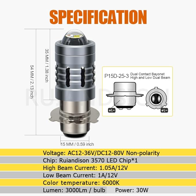 【AC/DCデザイン】AC/DC P15D-25-3 LED電球、DC電流とAC電流に適しています。 ACは12-36Vの電圧に対応しています。DCは12-80Vの電圧に使用できます。無極性設計。プラグ&プレイ。 バイク、オートバイ、モペット、三輪車などに使用できます。