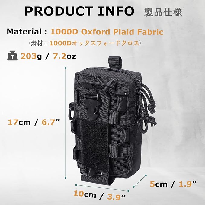 【材質】スマホポーチ1000Dオックスフォード布という耐久性に優れた素材で作られています。耐水性、耐摩耗性、耐久性に優れており、長期間使用することができます