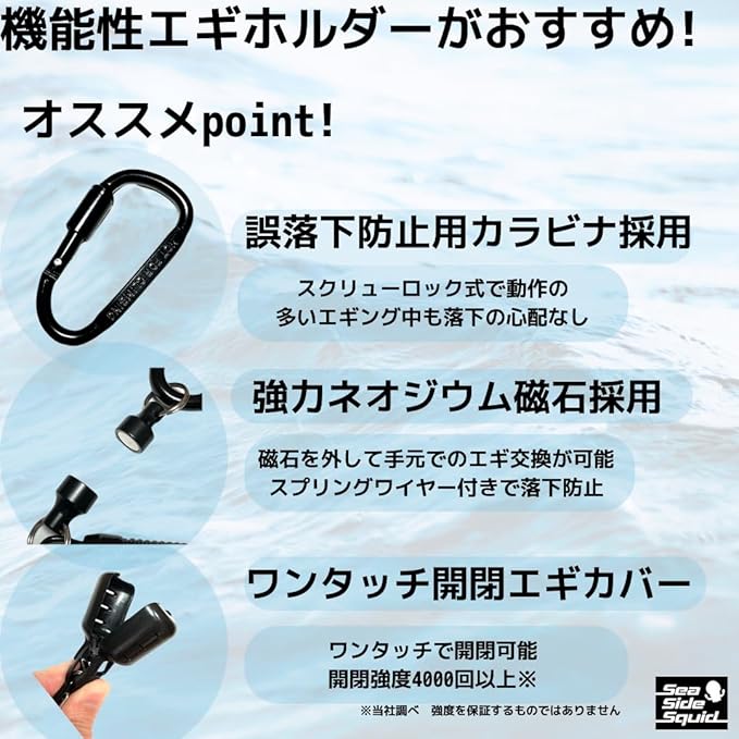 【説明】カラビナをバッグやズボンに通してエギと合わせて腰掛けることが可能です。ランガンやエギを頻繁にローテーションする方におすすめです。スパイラルチェーン付属のためエギの落下防止になります。