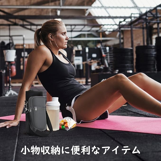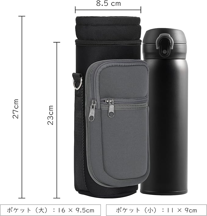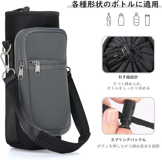 水筒キャリアカバー Nuovoware 水筒カバー ホルダー 手提げ ペットボトルカバー ポーチ 防水ネオプレン製 断熱 ウォーターボトル保護カバー 調節可能なショルダーベルト付き 8cm以下直径のボトルに対応(高さ23cm) Black&Gray