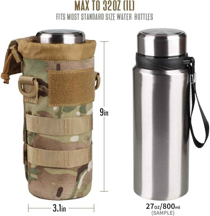 Molle対応で装着が簡単: 水筒ポーチの背面には2本のMolleストラップと金属製バックルが付いており、タクティカルバックパック/ベルト、その他のMolleシステムに取り付けることができます。2列のMolleウェビングを装備し、アクセサリーやMolleギアを取り付けることができます。