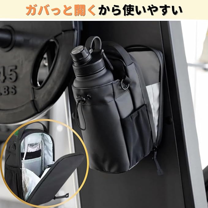 【スマホ、鍵、財布もまとめて管理】「ジムで荷物の置き場に困る…」そんな方におすすめなのがボトルホルダー機能を兼ね備えたこのジムバッグです。ペットボトルや小物を一つにまとめて持ち運べます。強力な磁石で安定して使え、カップホルダーやボトルポーチとして活躍します。ジムバッグとしても優秀で、スマホや財布などを大容量収納できる設計です。ポケットに小カラビナがついており、鍵をひっかかけることができます。全部まとまる快適さをぜひお試しください。
