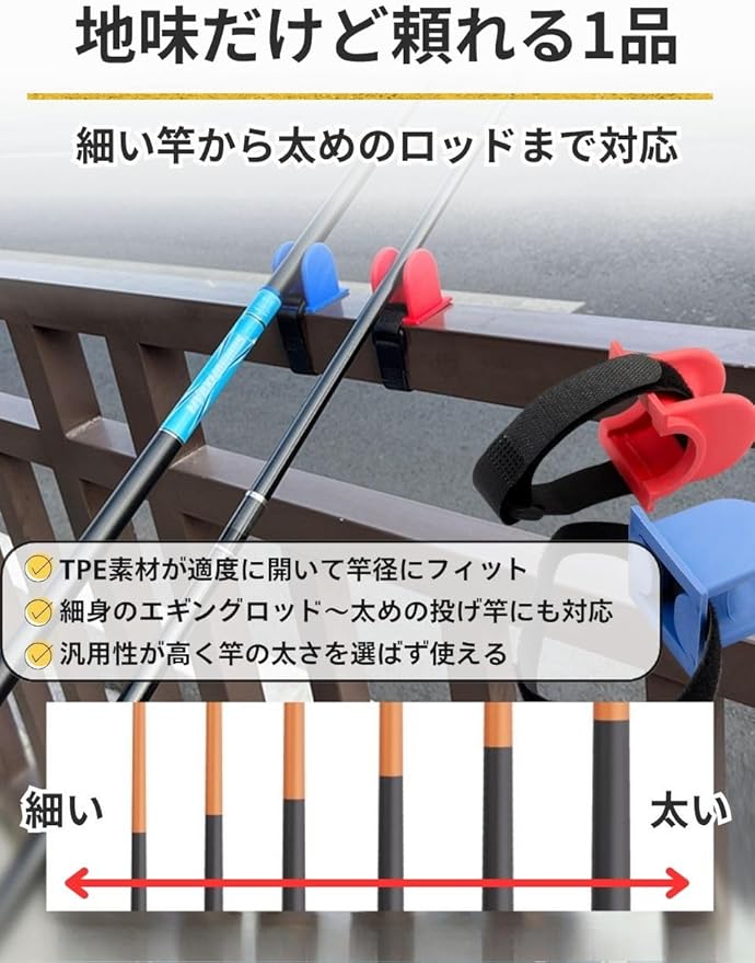 【竿を優しく支えるTPE素材を採用】ホルダー部には柔軟性と弾力性を兼ね備えたTPE素材を使用しています。竿に負担をかけにくく、細めの竿から太めのロッド(約1~20mm)まで幅広く対応可能です。素材自体に滑りにくい特性があり、しっかり支えながらも着脱しやすい設計です。大切な釣り道具を安心して預けられる構造となっています。